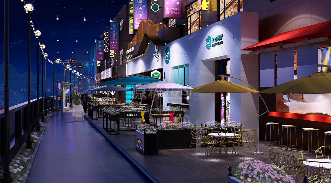 夜宴区域都是可以活动的座椅和花箱,旱喷广场中间设置了升降台,并在延草坪位置,增设的网红直播点位和公共座椅设计,以便吸引消费者前往内街进行停留消费。