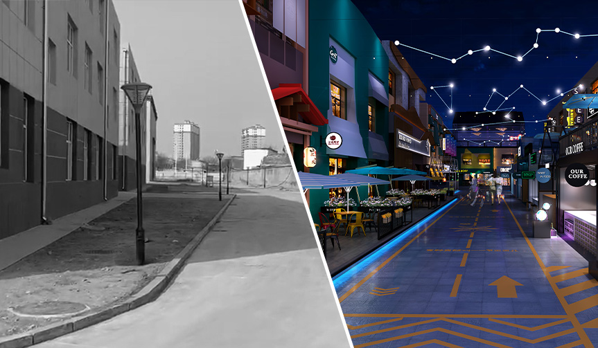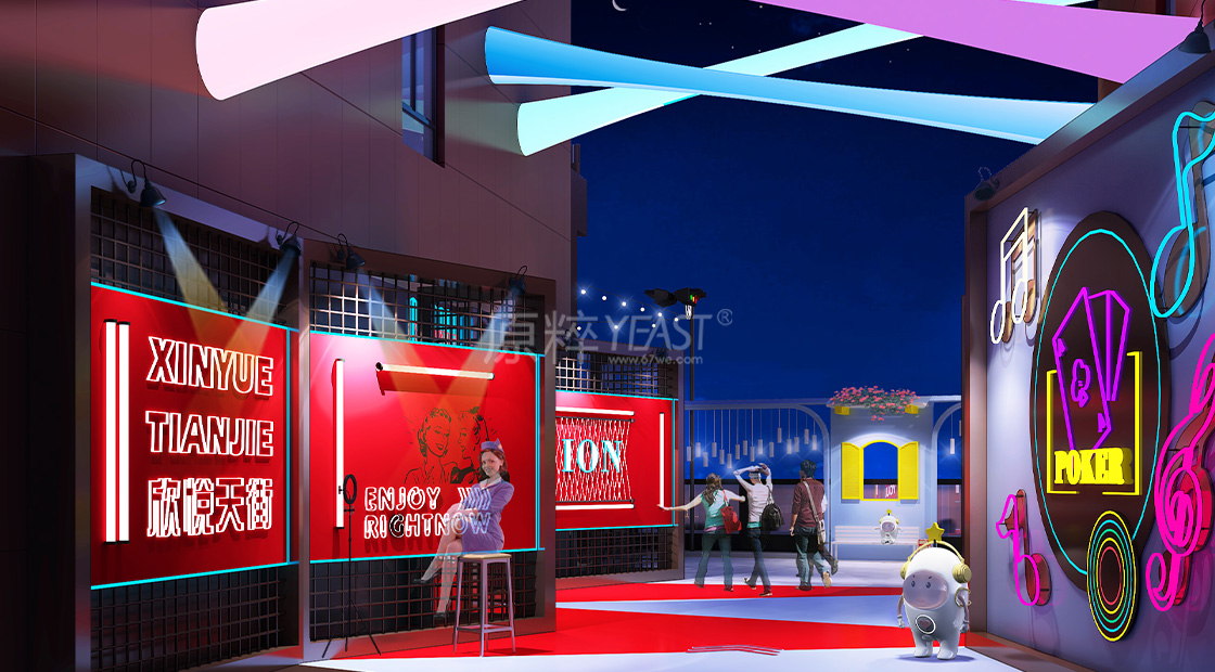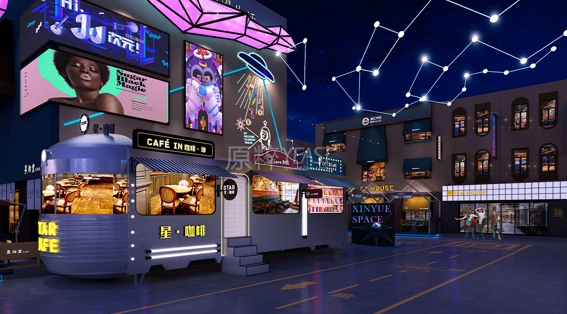 右侧的装置我们加上灯光,后期搭上话筒,也能成为网红直播的点位,有效聚集人气,在入口处形成热闹的感觉,充分吸引人走向内街