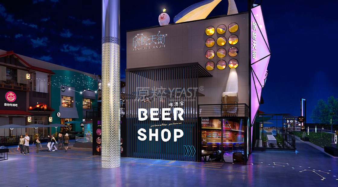 与旁边的酒吧形成卖点,平时举办一些啤酒PK赛,也是我们自持酒吧经营上的营销亮点,同时也可作为网红直播点位,兼具多功能和变通性。同时坐在旁边商铺的外摆散座,也可观看这边的活动,作为吸引客流的热点地段。