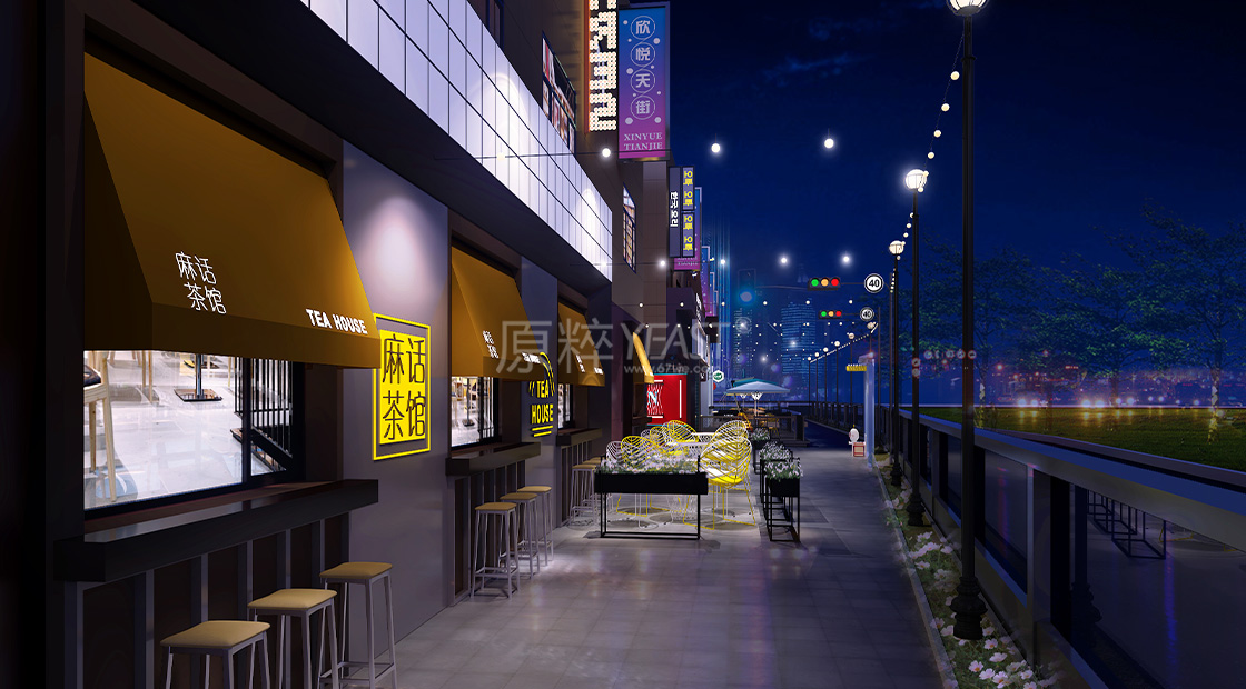 在临街外摆上,我们设计带架子的外摆区域,通过品质化的设计,人坐在这里,形成浓厚的氛围,同时,也兼并实用性,既能增加商家额外营业面积,同时也解决一些门面乱摆乱放的现象,规范形象。
