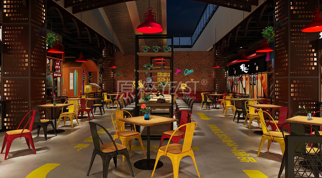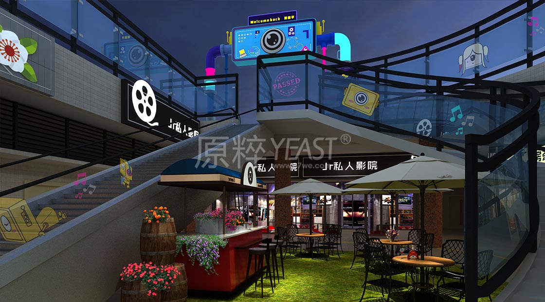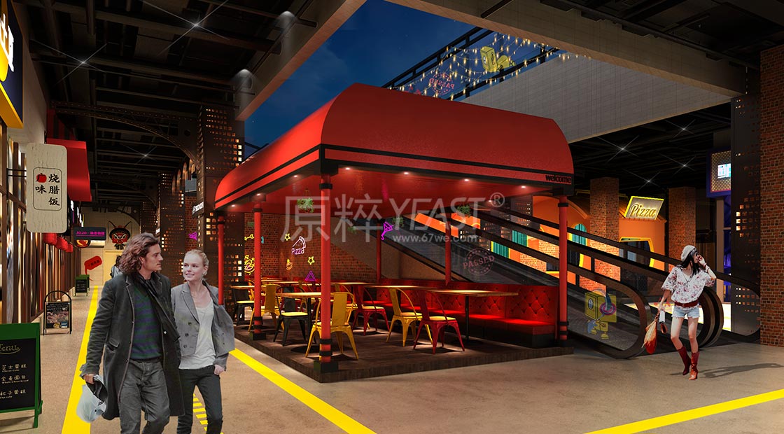 用增设售卖亭、外摆伞座的方式引导消费,并实现休息的功能性区域,并选择与店铺业态相匹配的散座花箱。再进行细节的搭配处理,实现材质与材质之间的碰撞