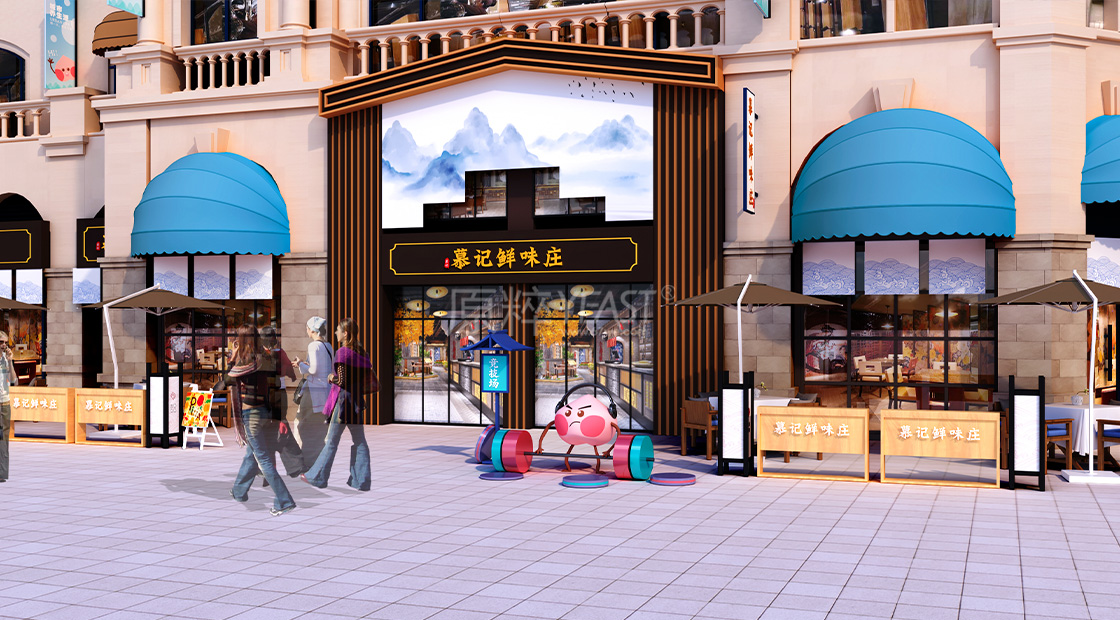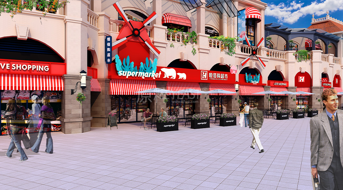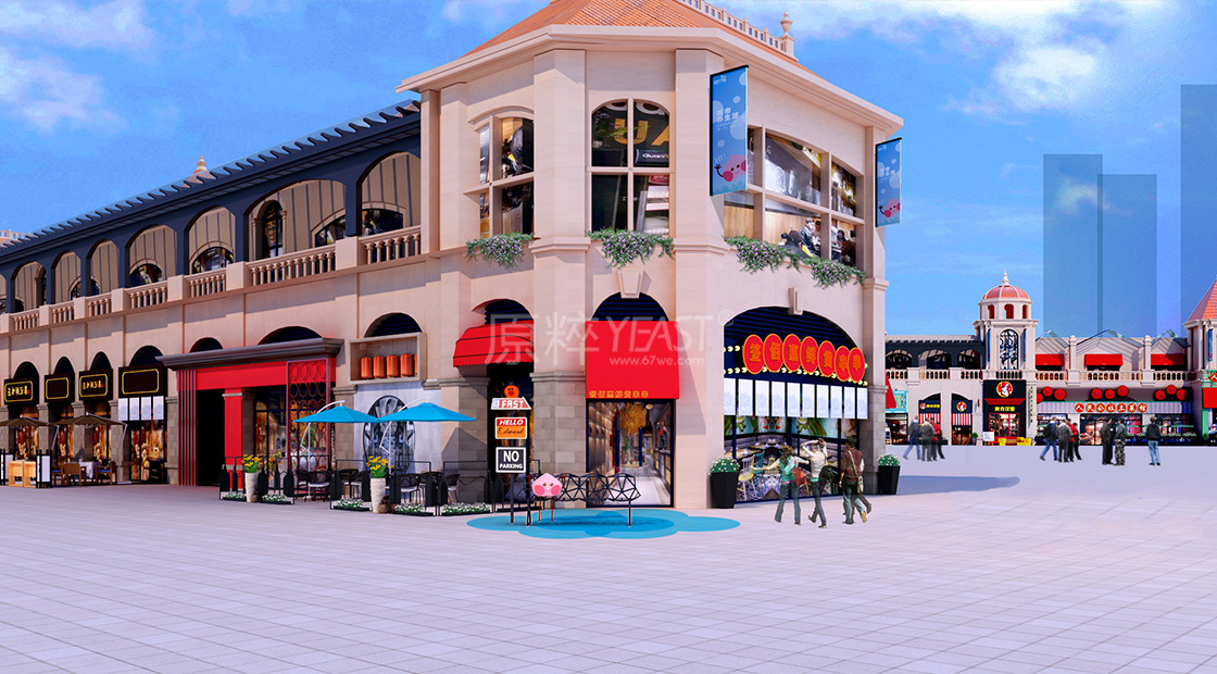 不需要昂贵材料的堆砌,从局部店门重点包装和次要包装,拉开街区层次,让商业更附有立体感,凸显健康养生氛围。建筑立面的色彩上偏暖色调,冷暖对比的色调是空间画面感更为丰富,不会产生视觉疲劳,审美疲劳,局部建筑加上IP形象,形成视觉记忆。