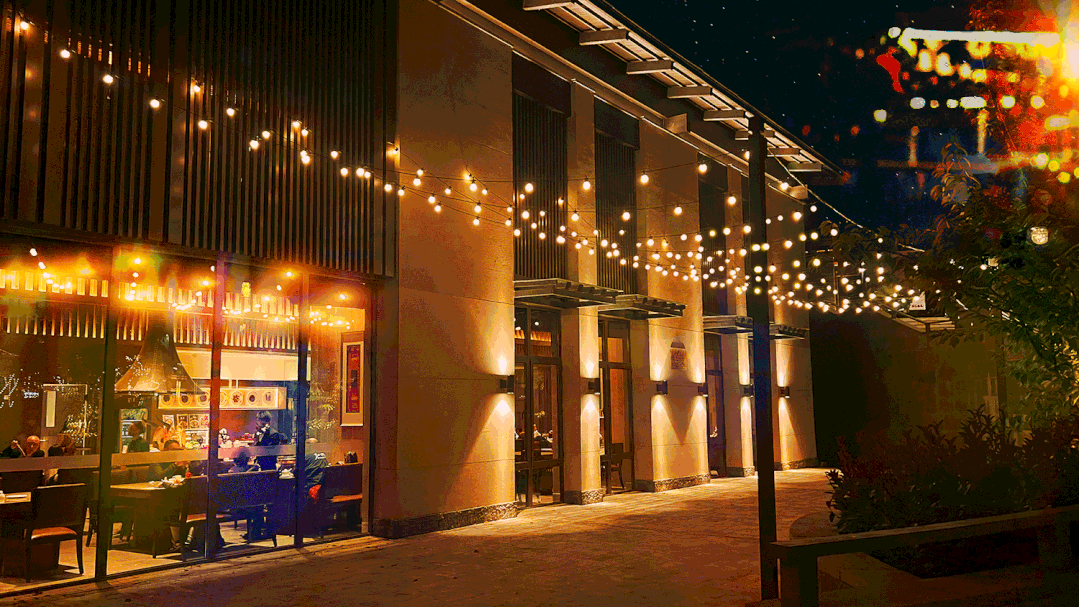 缤纷烟火气,不仅需要美食来点亮,更需纷纷灯光来映衬。在餐饮和美食区,通过增加跨街亮化等,来丰富夜间氛围,形成项目最显眼的记忆点,也使得整个项目更具有夜晚烟火气。