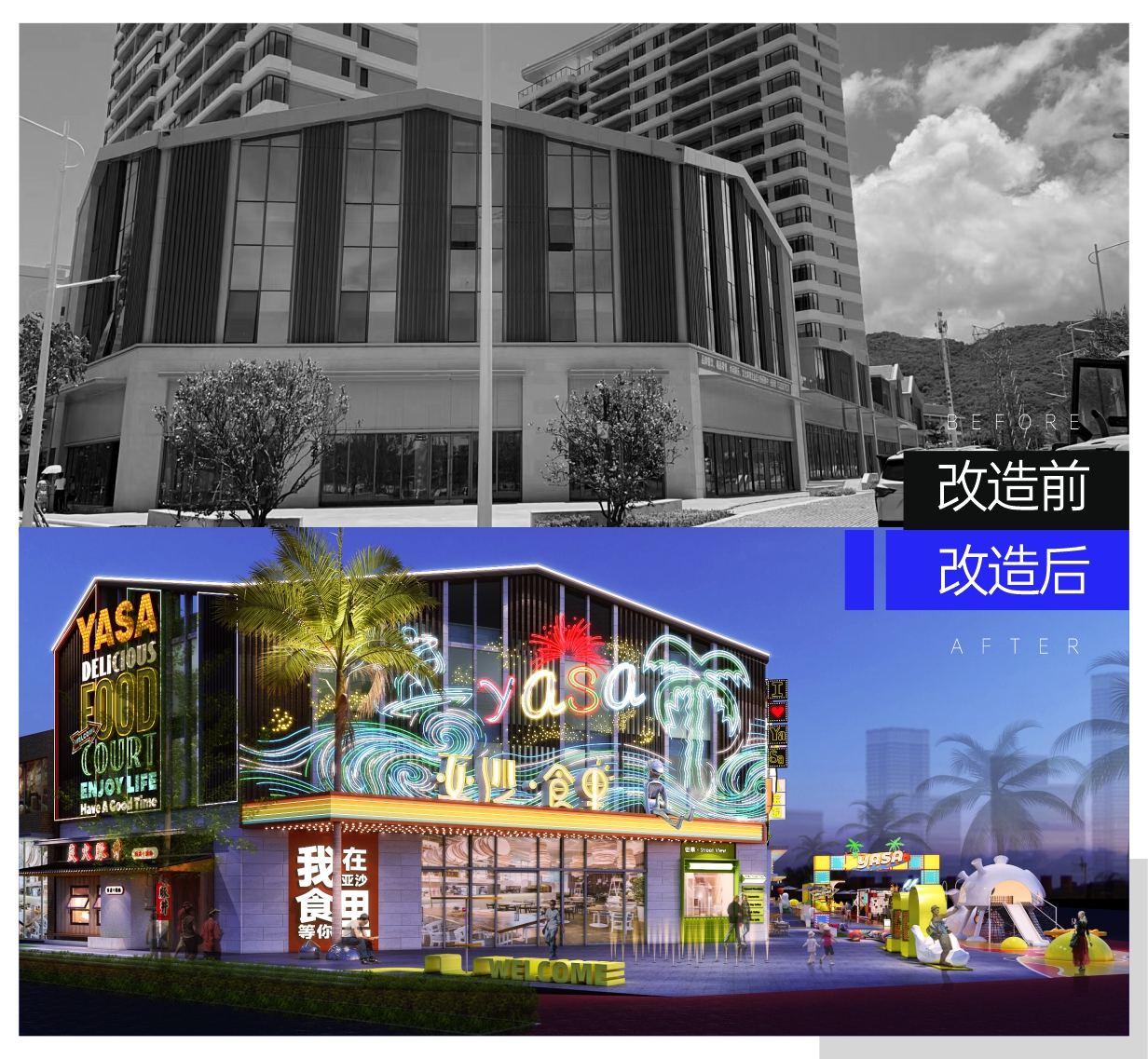 原粹商业前期聚集调研三亚城市发展政策,敏感捕捉三亚政府发展三亚特色“夜经济”的指示动向,结合项目区域优势与商业特性,将“夜三亚,潮生活”的概念植入消费场景,打造亚沙“夜经济美食聚集地”定位,让其在城市商业竞争格局中建立特色脱颖而出。