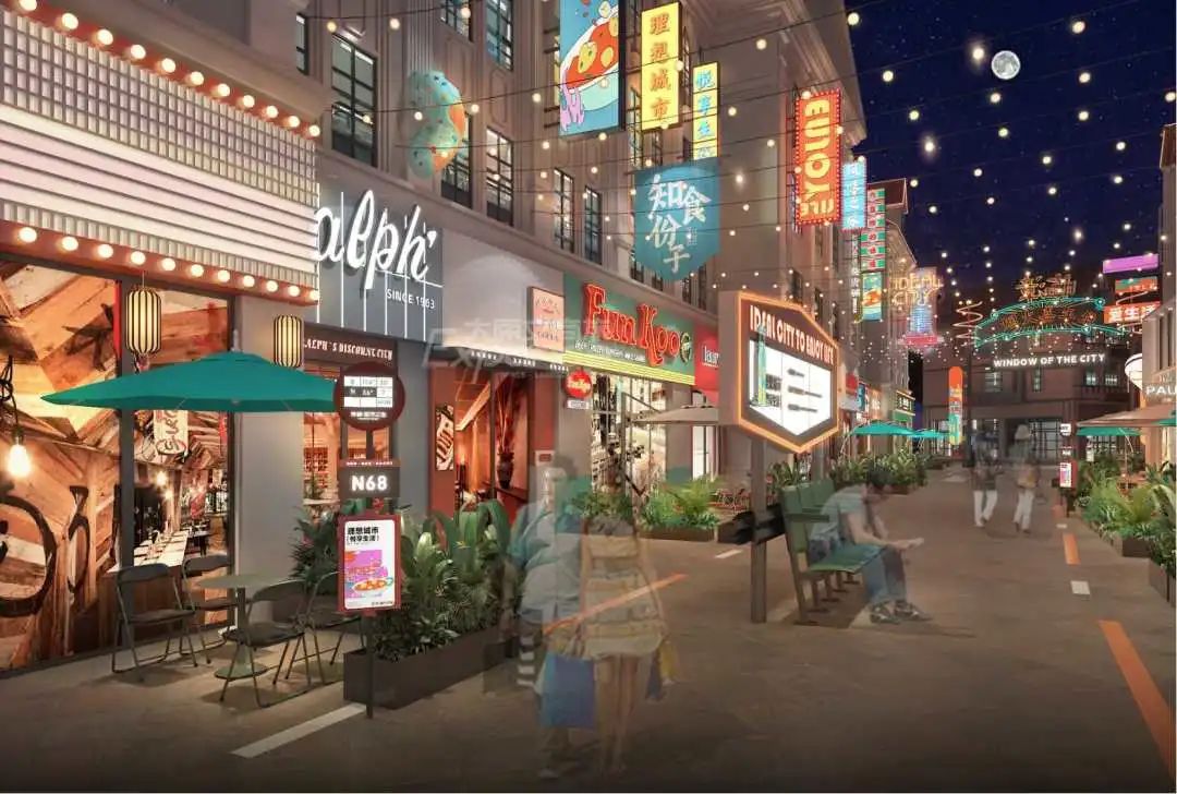 商业场景设计围绕“新烟火美食主义”主题,打造“烟火食集与品质生活”两大主题场景。利用港式风情建筑装置、临漳城市特有元素,以及网红灯光装饰,打造融合港式风情与临漳现代城市的沉浸式主题街区,极具个性的主题场景形成强昭示性,在城市商圈中脱颖而出。