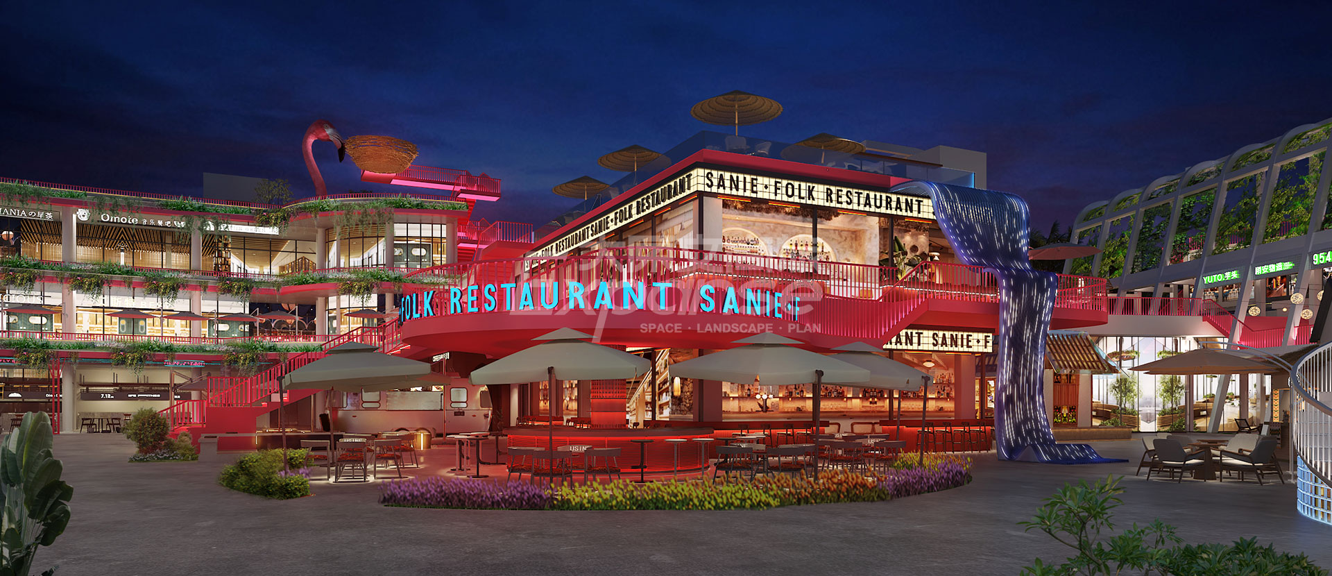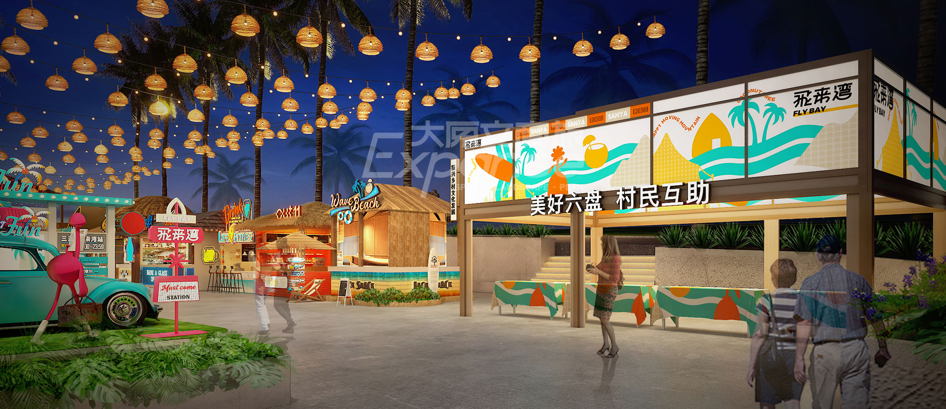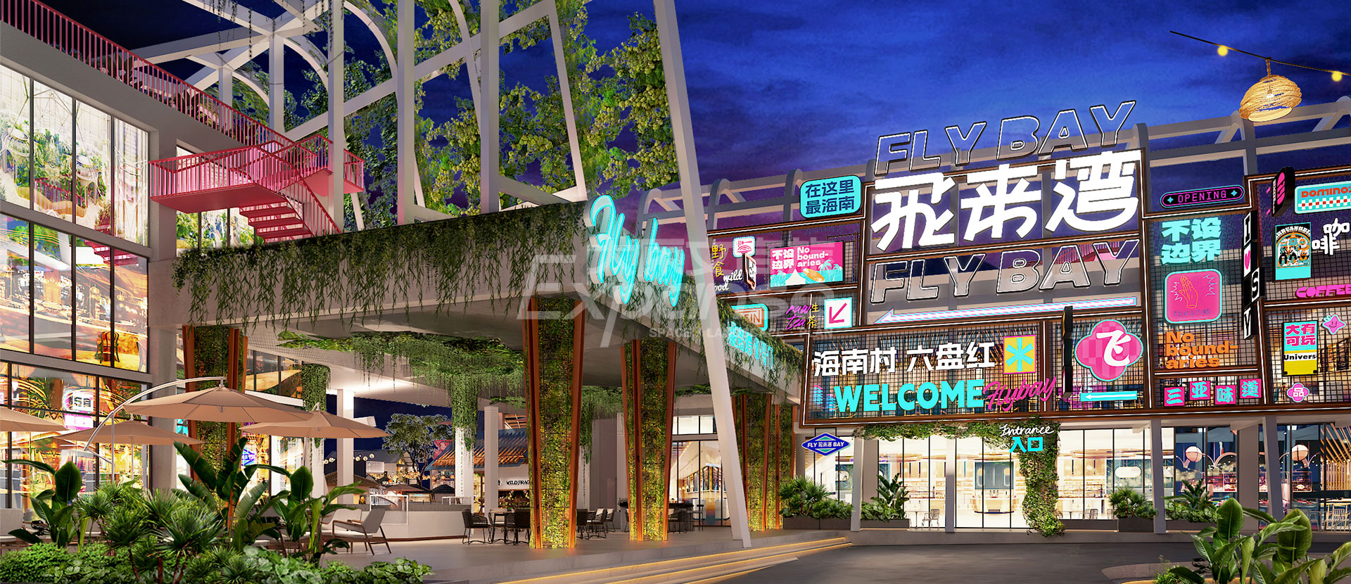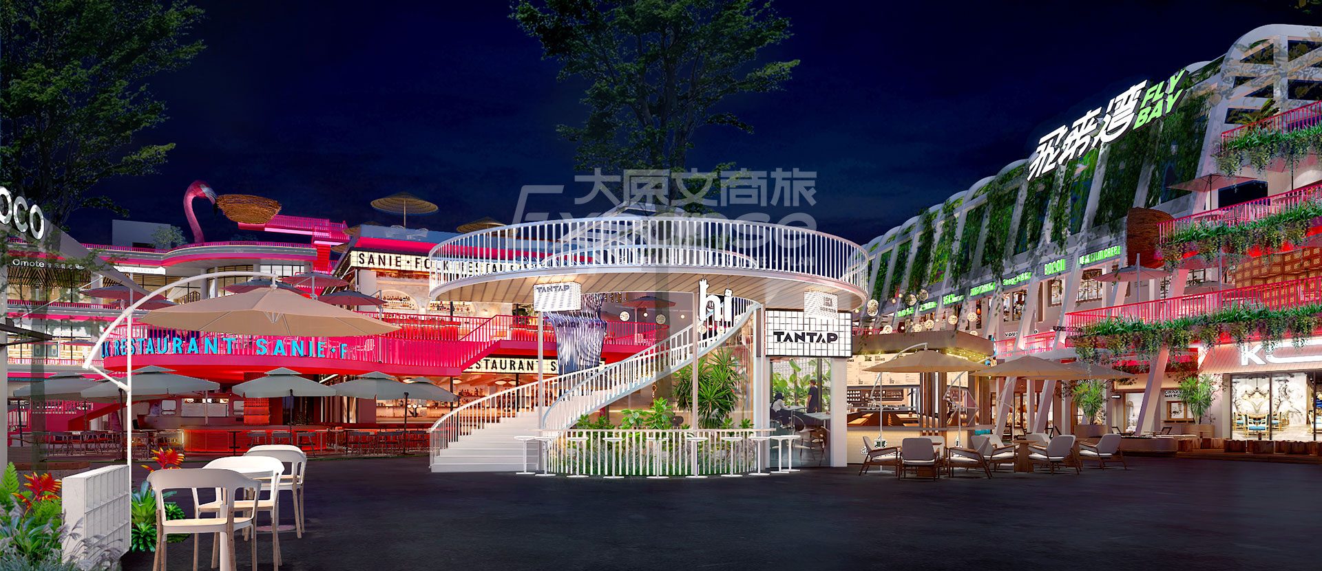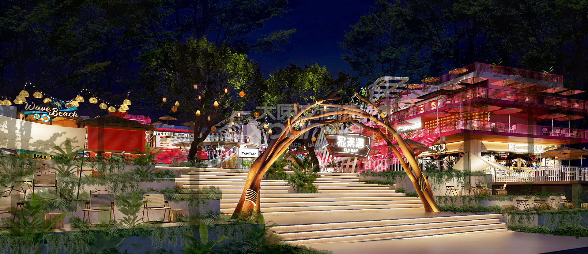 原粹将山海资源和人文环境作为创意描点,营造【六盘村·最海南】的商业标签。原创设计【六盘红】主题色,将主题色大面积植入商业场景,形成记忆标签,构筑项目的独特性和排他性。此外,项目场景设计围绕着休闲无厘头、年轻趣味化的场景出发,形成品质活力的年轻消费氛围,助力项目形成年轻力潮经济剧场,打造“飞”来不可的旅游目的地。
