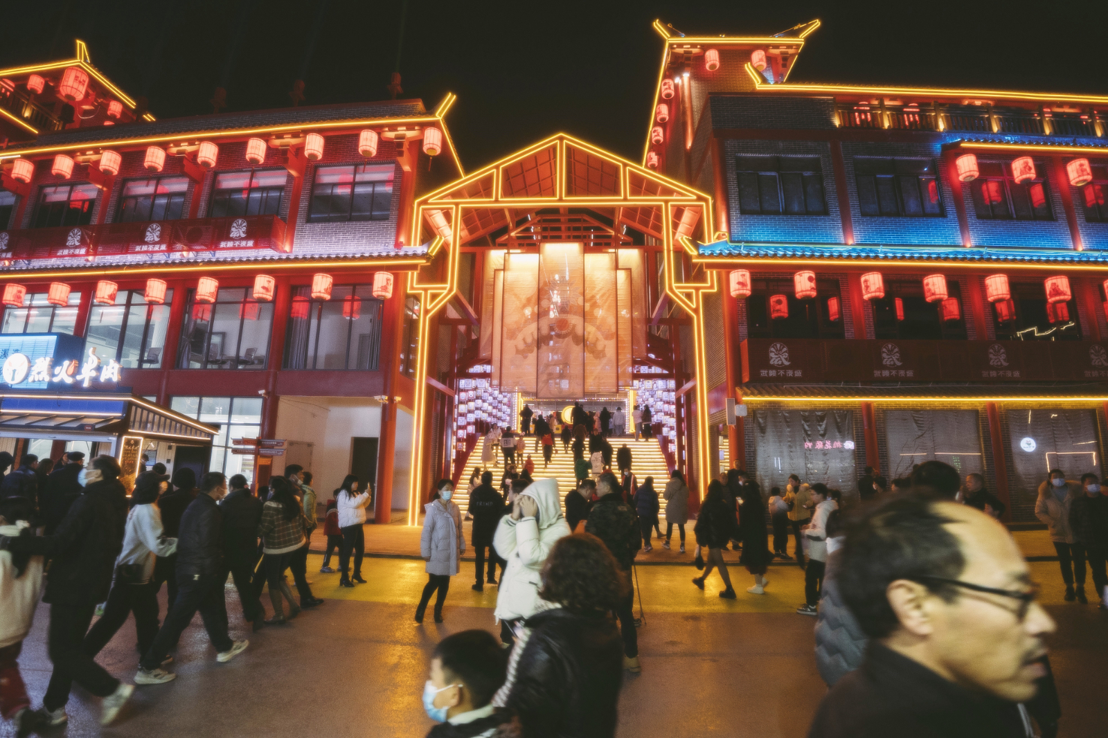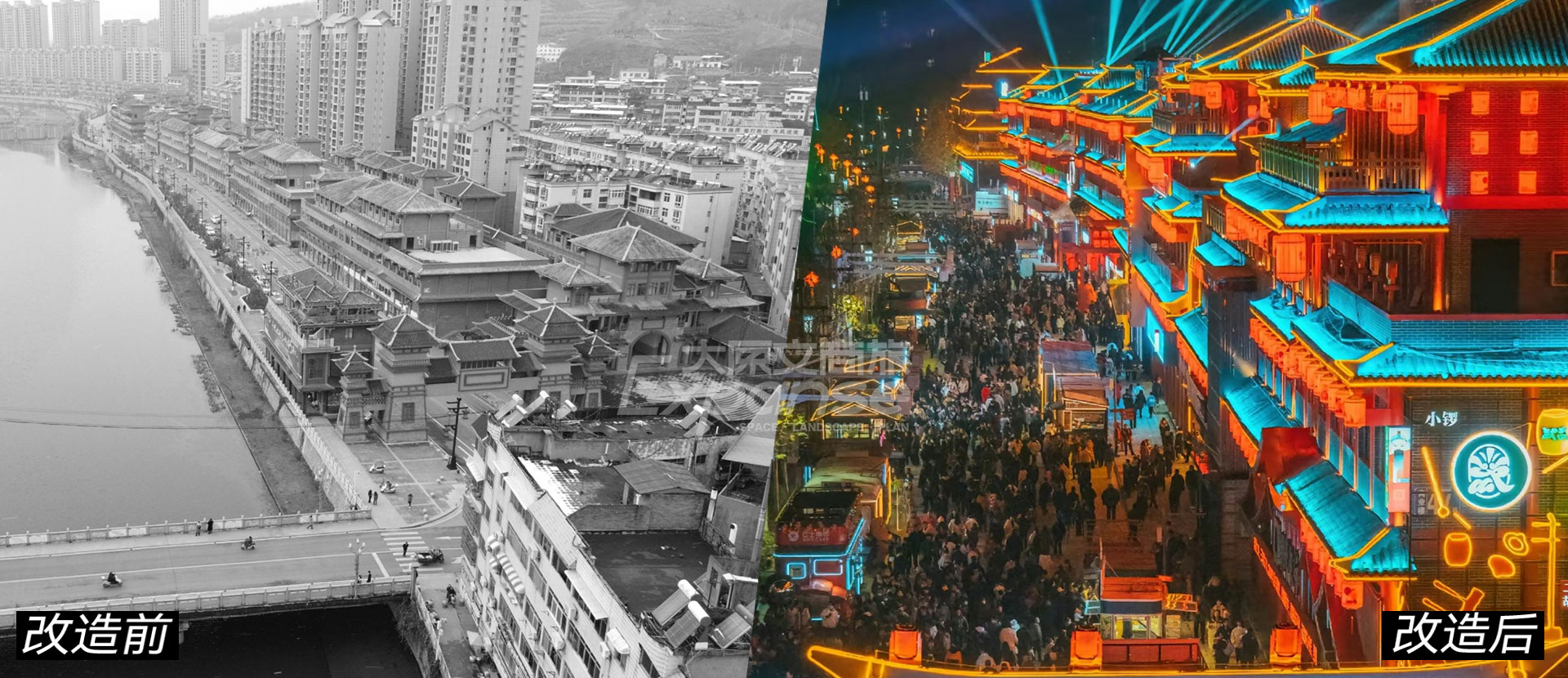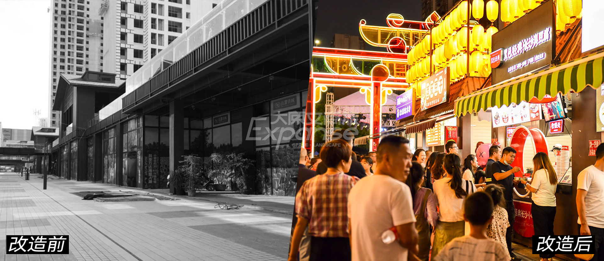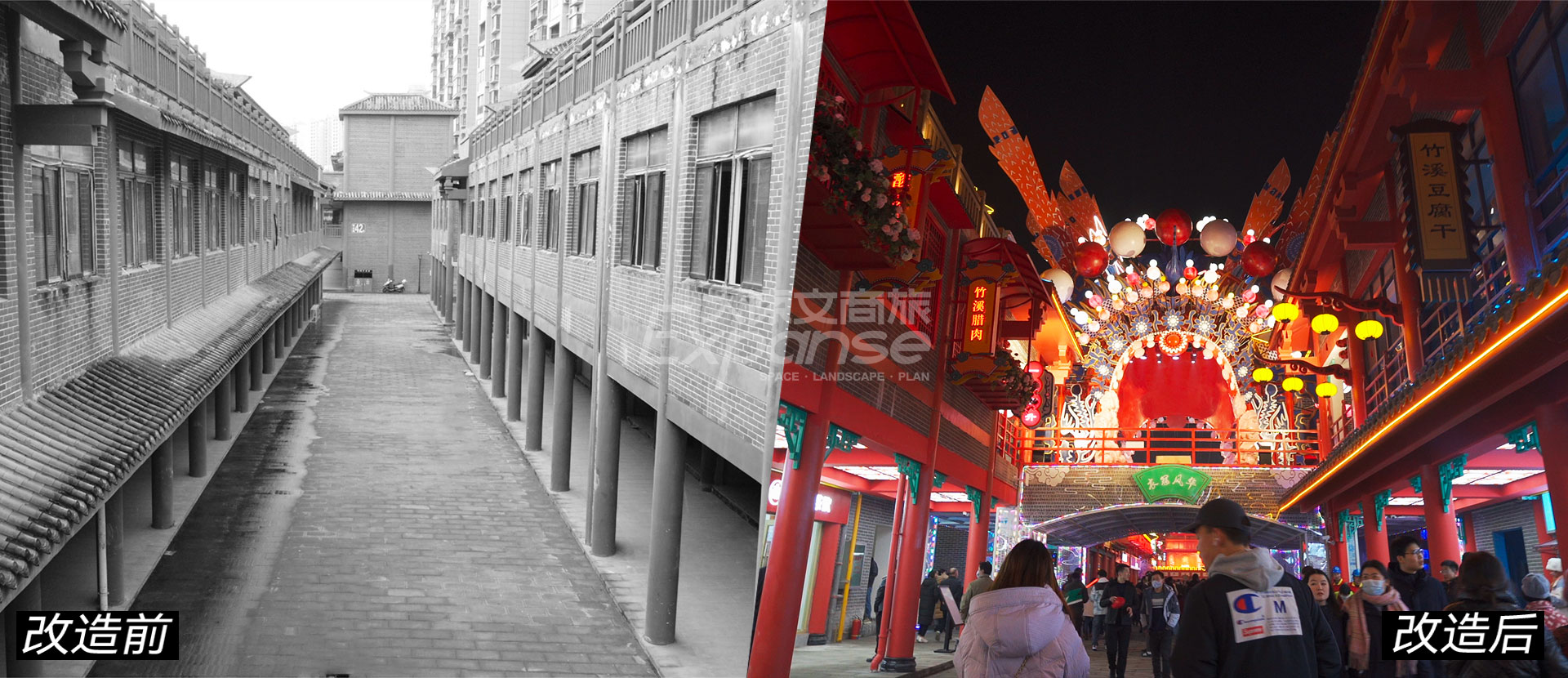 以文化、民俗风情资源为依托,融夜间经济、餐饮娱乐、文化鉴赏为一体,怀化夜市成为城市文化风情的集中代表地。通过文化赋能,怀化夜市不仅有效化解万达业态挤压,实现招商30天商业全盘认筹的经济效益,更获得ID+G国际空间设计大奖/金创意奖,入选“湖南省改造提升试点步行街”名单。
