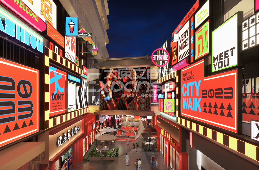 商业内街以“微观成都”为设计核心策略,将成都特有的文化元素与地标元素,高度浓缩到商业建筑标识中,形成独具有探索魅力的“城市漫游路线”,打造出商业独特卖点,达到话题度和传播度的双重效益。