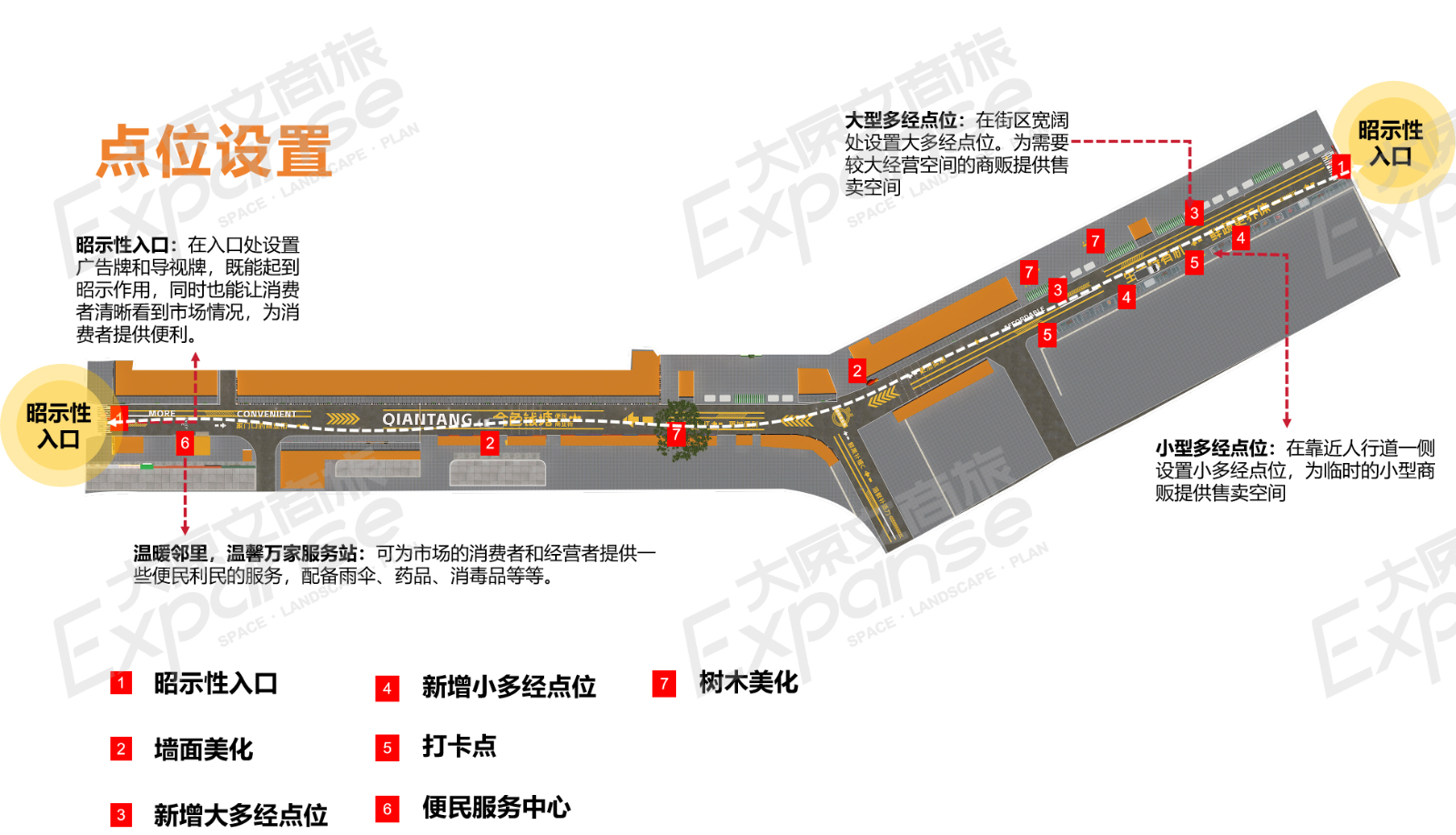 通过昭示性强烈的商业入口,吸引夜间消费人群。根据运营主体、消费者、商户摊贩三方需求,分类分区设置摊位经营点,便于销售和管理。增添便民服务点,升级街区购物体验,提高周边居民高频次消费和用户粘性。