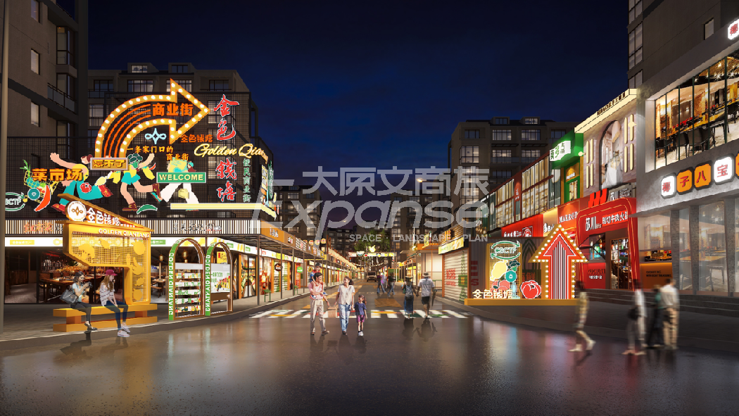 经过专业分析,原粹商业发现项目周边人流量庞大,夜市氛围浓郁;然而附近600米有相对成熟的竞品夜市,客流竞争严重。因此,原粹商业以差异化竞争、盘活项目人气为场景设计目标,打造现代潮流主题夜市美食街,助力项目溢价招商销售。