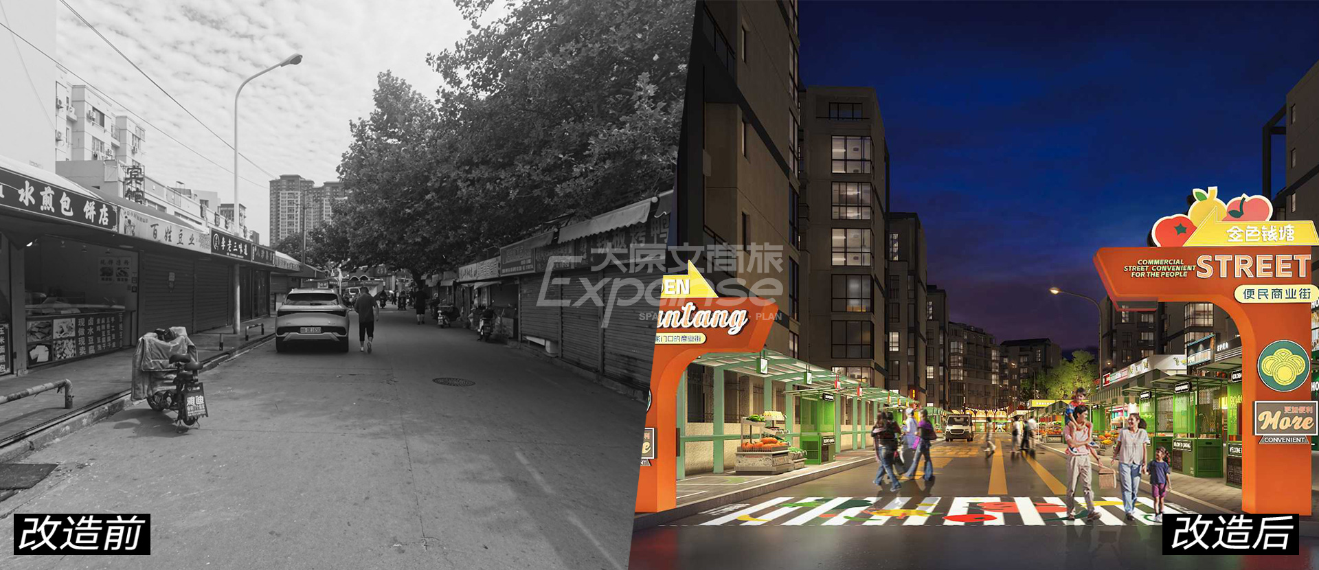原粹商业深入研判后发现,项目周围人流量密集,夜经济客群基础良好,且片区夜间消费场景存在空白。因此原粹商业从形象、功能、体验精准发力进行场景升级,以便捷、灵活、有温度的地标性复合型日夜市集为目标,打造“生活市集×便民服务”金色钱塘便民街,从根本解决商业问题。