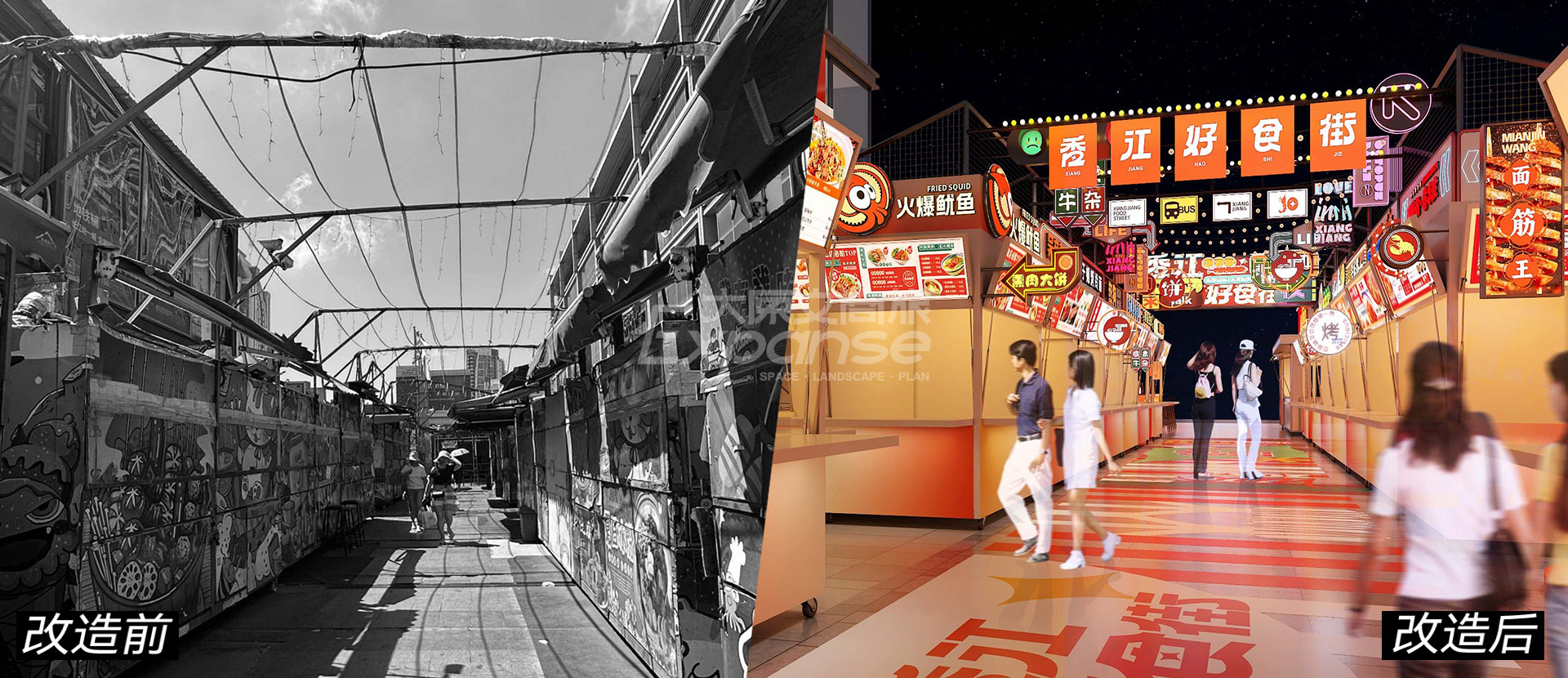 以“深夜食堂 × 趣味天地”作为商业场景设计创意点,原粹商业将青岛的海洋特色与本土美食特色相结合,包装香江好食街商业主题故事、统一视觉形象、优化灯光亮化,设置昭示性门头和网红爆点性景观,主题化打造餐车门头,大大增强商业区吸引力。