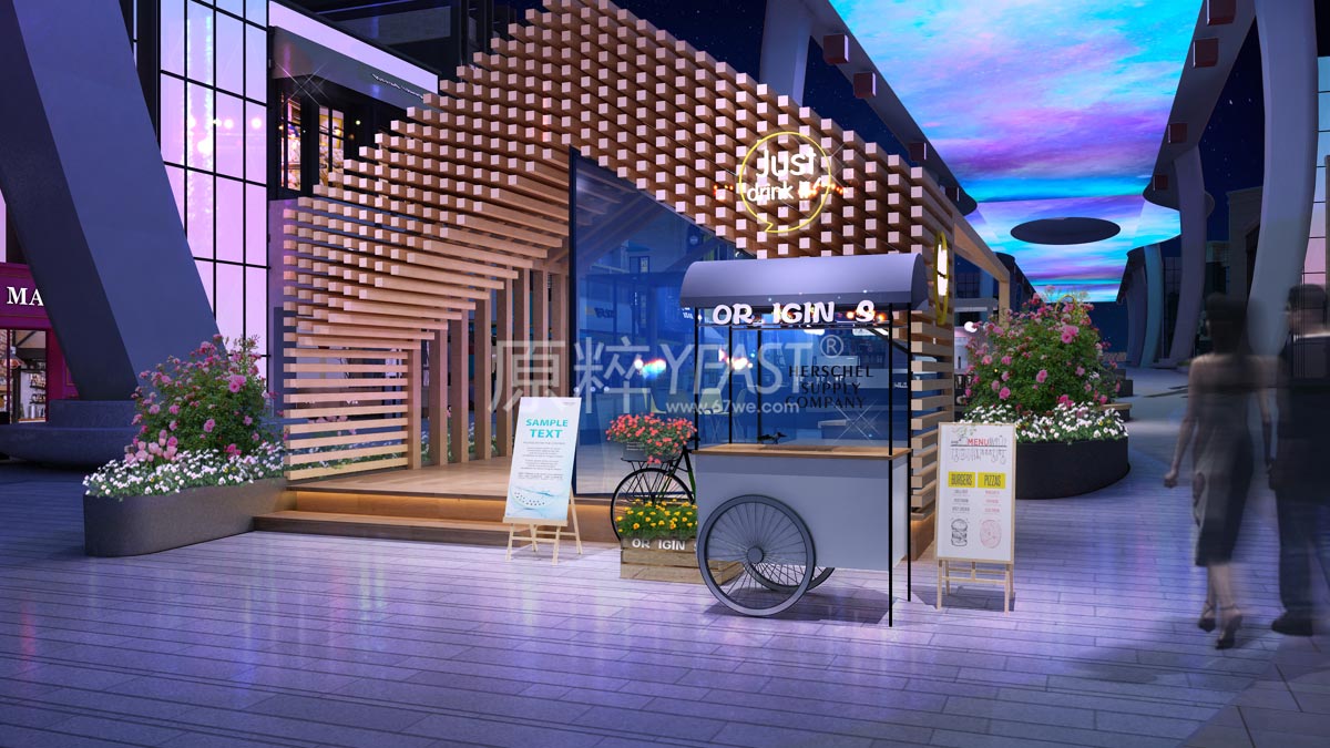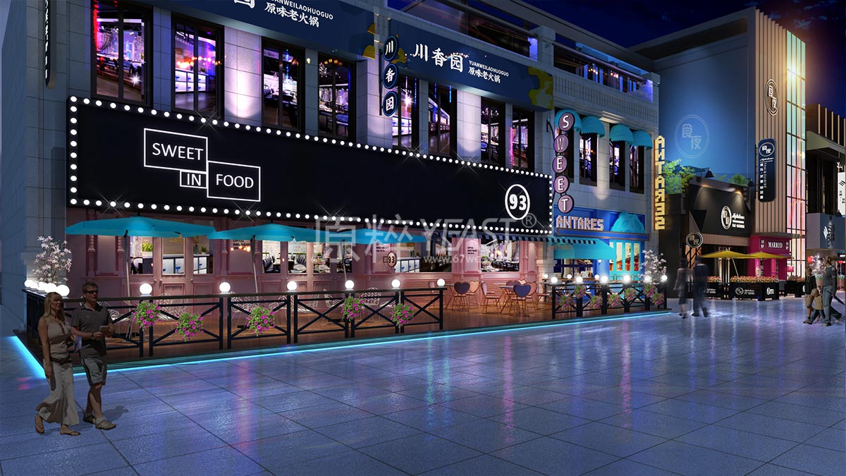 后半段受众人群大多为青年人、学生客群等,了解到目标人群需求,我们将在氛围打造上主打年轻审美的环境。结合景观小品,形成有聚落性的外摆空间,每个消费点相互独立,但也相互融合。