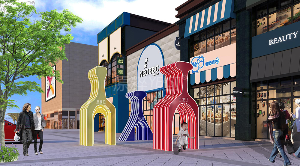 门头用了色块+线条性的框架去做整体造型,形象门是入口处重要的展示面,昭示街区主题和品牌形象,而这条街,是主打餐饮娱乐,那么我们在设计时,我们希望通过大气缤纷的夜间效果去吸引人群。