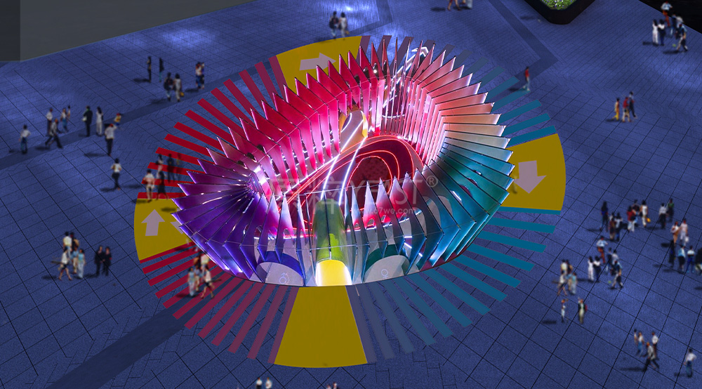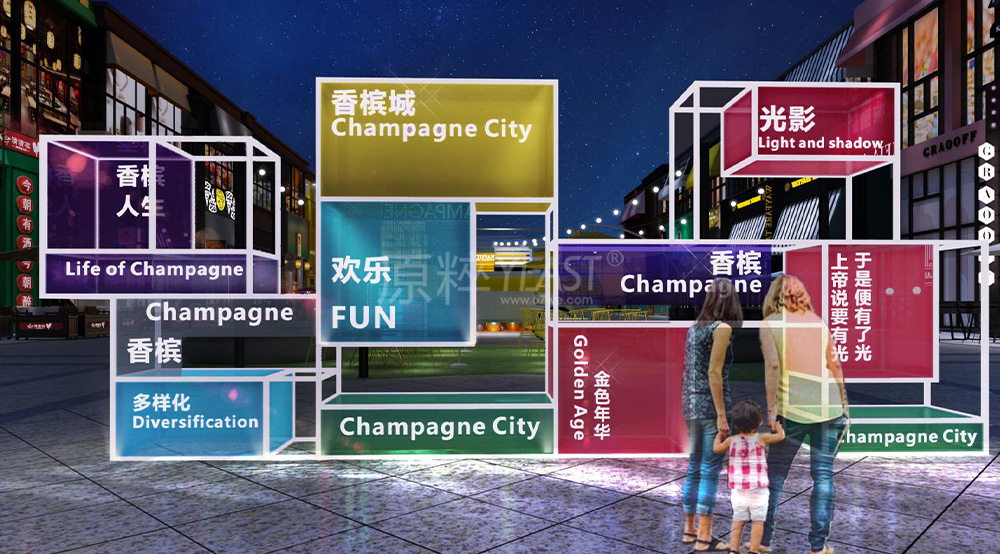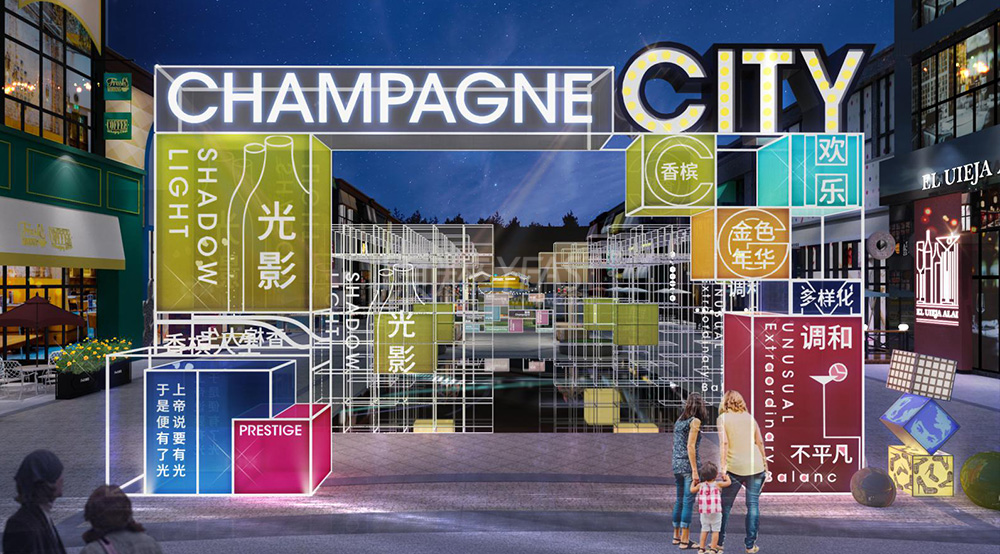 香槟时光主题互动装置,这是我们综合体靠西河达到的主入口,酒瓶形状的时光廊道,让人参与其中,穿梭其中。在夜间通过光影结合雕刻形状,来体现穿梭在香槟时光的隧道里,实现互动体验与分享。