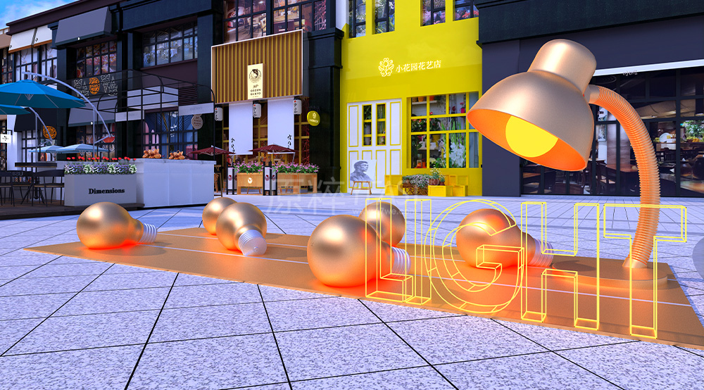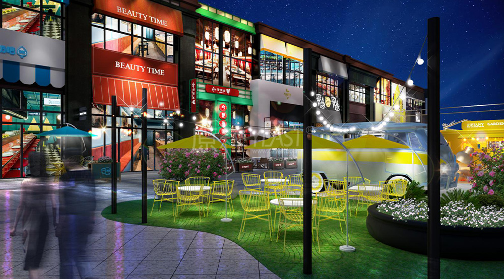 在光影香槟城街道,我们运用光影加香槟的元素进行结合设计,主打白天精致、品质生活,夜间缤纷光影效果,使得夜间与白天皆能呈现良好的效果。