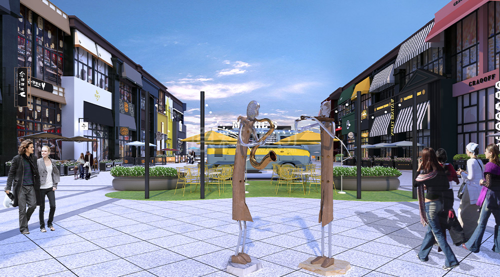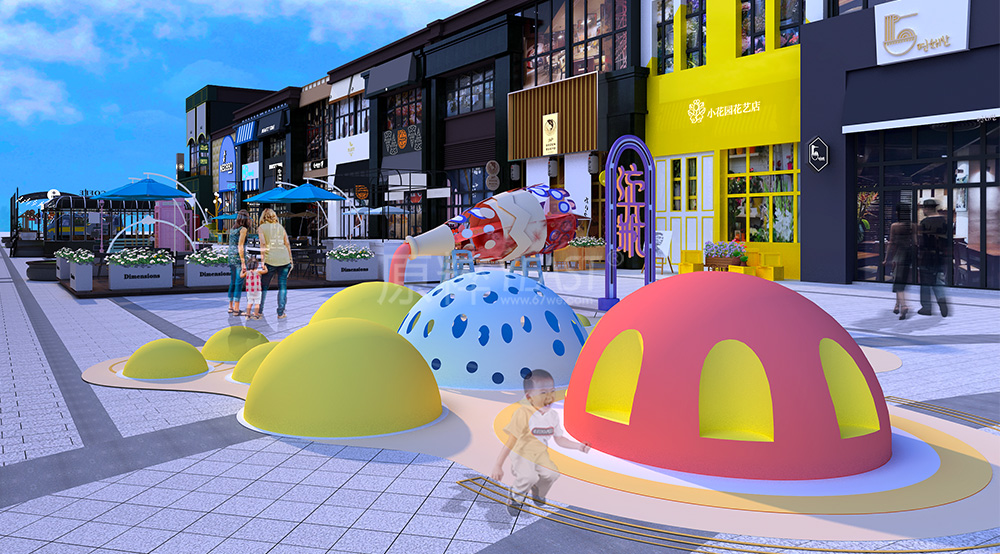 街区中部雕塑小品,局部互动打开区,将生活中极小的物件,放大化,增加趣味性。