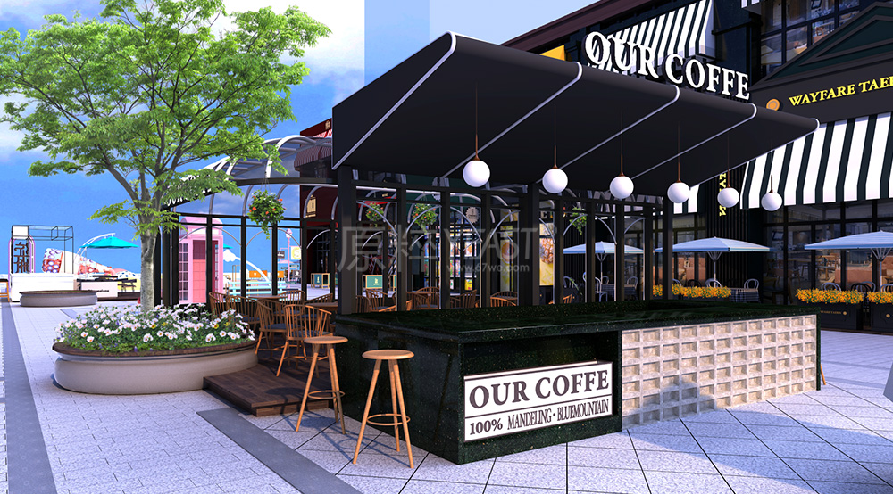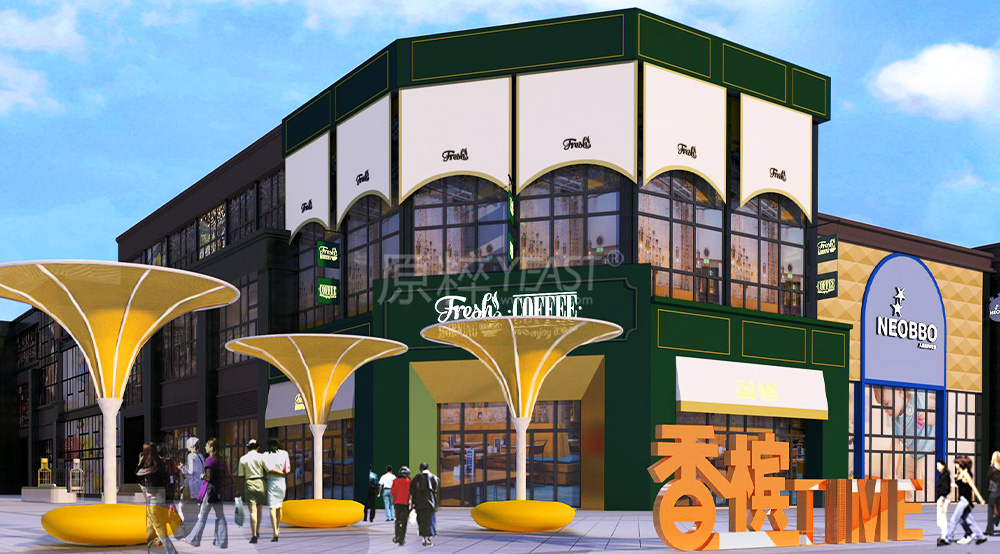 在内街的组合式售卖区域里,我们希望人群在此处停留,休息,所以在整体的组合外摆设计上,我们通过简约的造型和材质的相互搭配,来把控整体品质感和精致感。