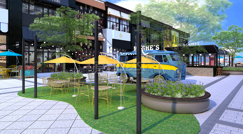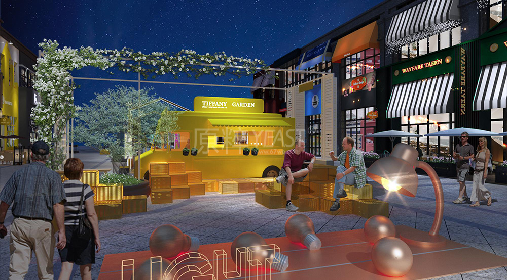 在入口区域,设计花艺式的拱门,上方设计小灯珠,提升夜晚经营氛围和休闲邻里氛围,我们希望来到这里的人能停留下来,慢下来,享受生活。