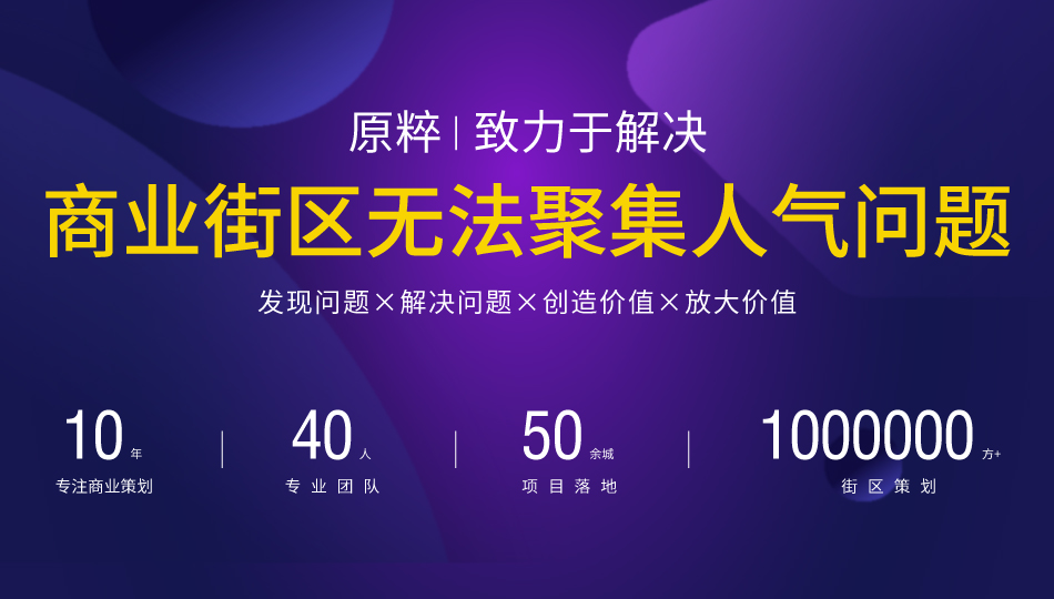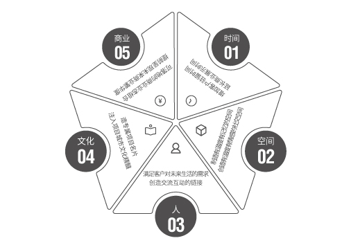 提出以人为驱动,提出公园化商业、体验式商业、网红商业街等多种商业问题解决方法,通过团队创造的原粹铁三角定律以及独有的商业地产社群营销模式,为每一个项目进行全方位商业策划。解决商业形象管理问题,提前呈现商业繁荣度,将直观的展现给消费者商铺的高端价值。